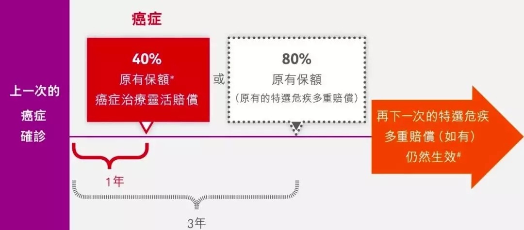 癌症多重赔偿:额外4次癌症、心脏病、中风赔偿,每次为原保额的80%,其中两次癌症赔偿之间的间隔期最少为3年,其他重疾赔偿之间的间隔期最少为1年;
