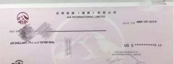 在3月5日友邦又再次发出支票(如下图),退回客户部分保费1629.67美金+保单徵费5.13美金。最为关键的是,客户此次理赔后,保单并没有结束,且无需缴纳保费继续享有保障,合计是160%的保障额度!