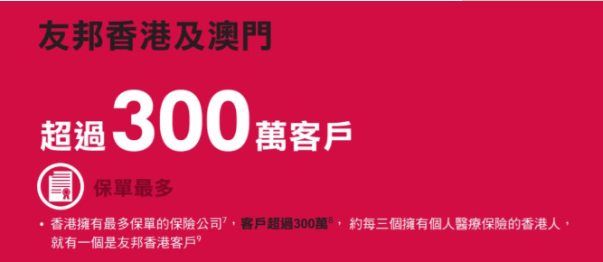 公司总资产逾2000亿美元,在港澳地区拥有超过300万客户,约每四个拥有医疗保险的香港人,就有一个是友邦香港客户。