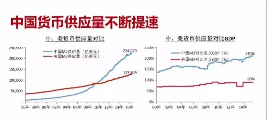 货币供应量不断增速,过去20年里,中国的货币供应量增速为19%,美国仅为7%。货币超发带来的连锁反应就是货币贬值,通胀加大。过去100年美国通胀年复合增长率达到3.3%,从1913年开始到2015年美元购买力贬值了97%,每年贬值3.3%;人民币完成这一壮举只用了30年,期间人民币的购买力贬值了91%,每年贬值9.3%。也就是有100万的人民币,9.3万就没了。