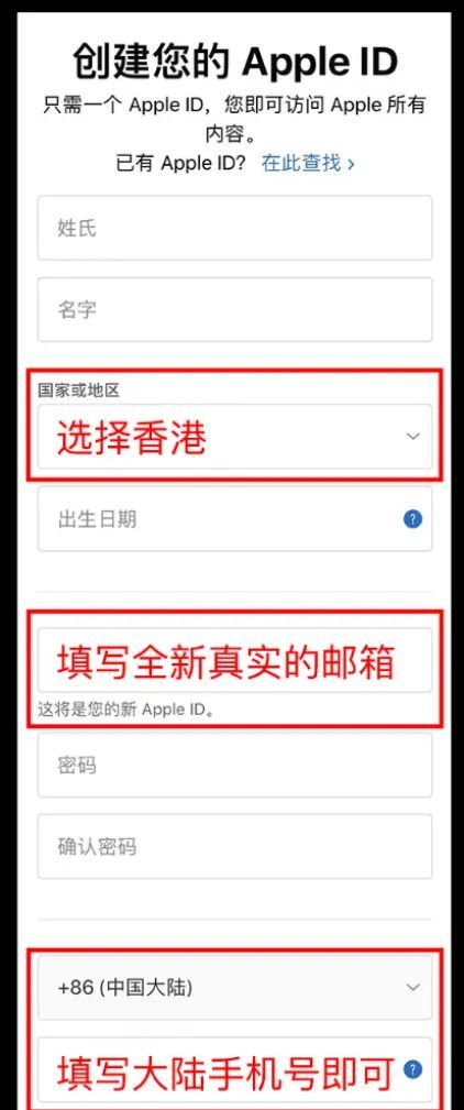 根据提示输入您的个人相关信息,在国家和地区请选择 <香港>,准备一个从未注册过 Apple ID 的邮箱,