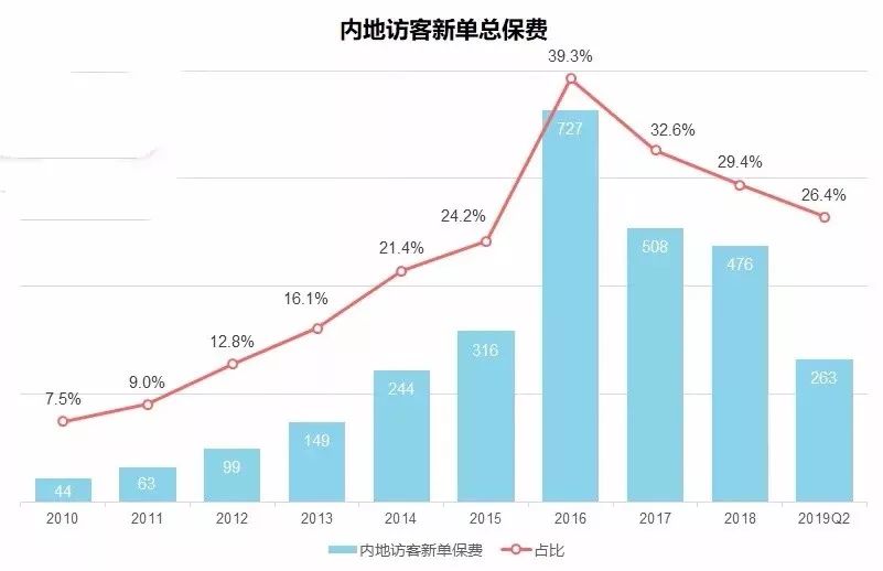 内地访客带来的新造保单保费在2019年上半年稳步上升,有关新造保单保费高达$263亿港元,占个人业务总新造保单保费的26.4%。