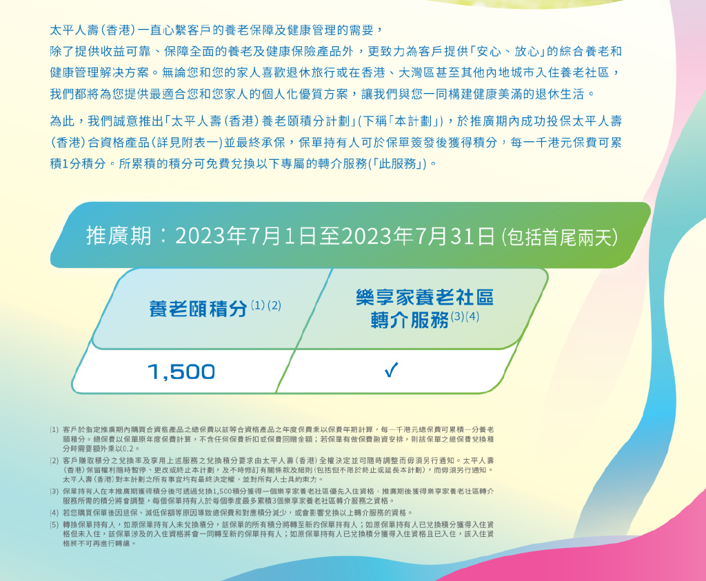 活动期间,可使用太平人寿(香港)养老颐积分75折兑换“乐享家”养老社区入住资格(折合保费金额为150万港币)。