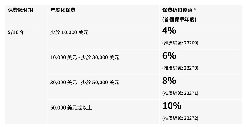 优惠:缴付保费年期为5年或以上可享高达首年6%派息率优惠
