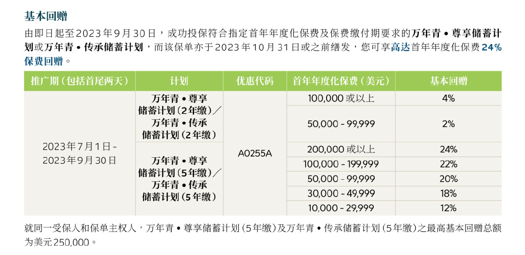 保费回赠:投保「优月储蓄计划(2年缴)」,首年年度化保费达12,500美元,享2%保费回赠优惠;