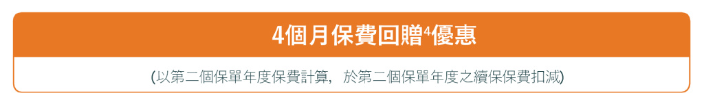 优惠:基本保费回赠高达20%;如果每年保费超8万港元,享额外优惠,合共高达30%保费回赠。