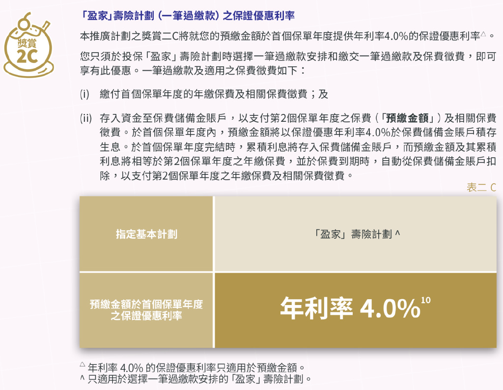 优惠:成功投保2年缴「盈聚环球」并预缴保费,享4.6%保证年利率。