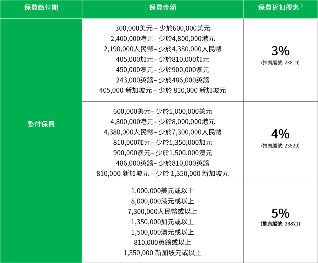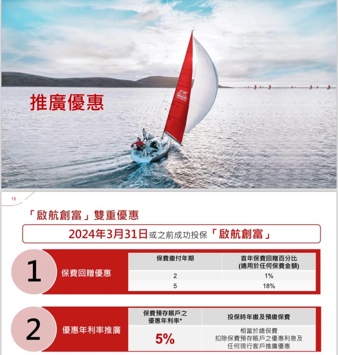 优惠:美元保单2年预缴享8%保证利息、5年预缴享5%保证利息;港元/澳门元/人民币保单预缴享4.5%利息。