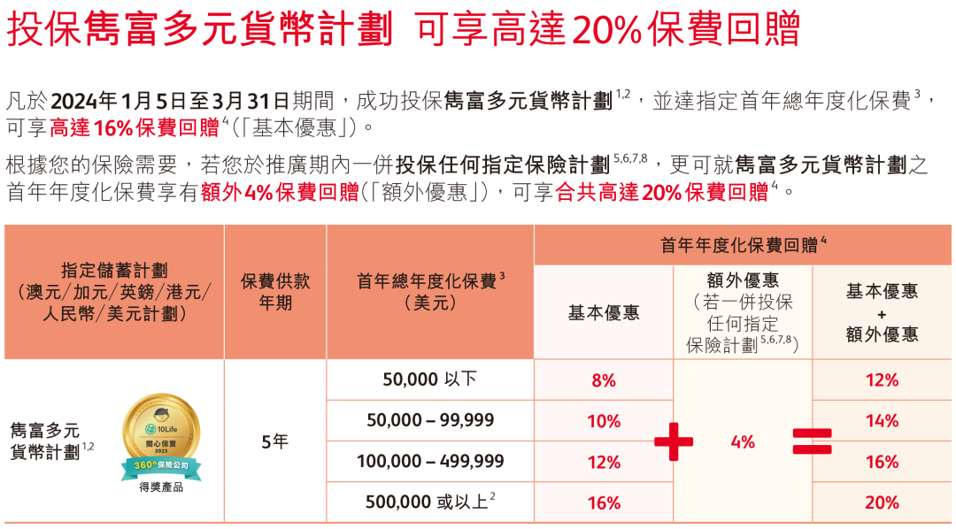 优惠:单独投保「隽富(5年)」,可享高达16%保费回赠;同时投保储蓄险「隽富」和危疾「危疾加护保3/危疾首护保2/诚保一生」,额外多4%保费回赠,享高达20%保费回赠。