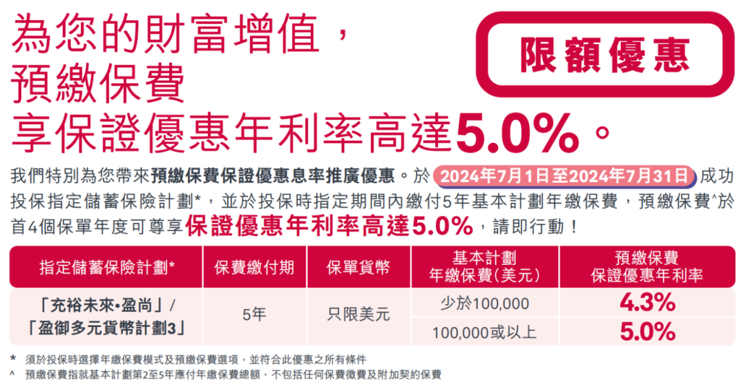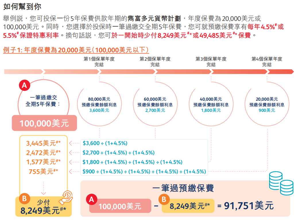 - 预缴优惠:美元保单2年预缴享8%利息,5年预缴享5%利息