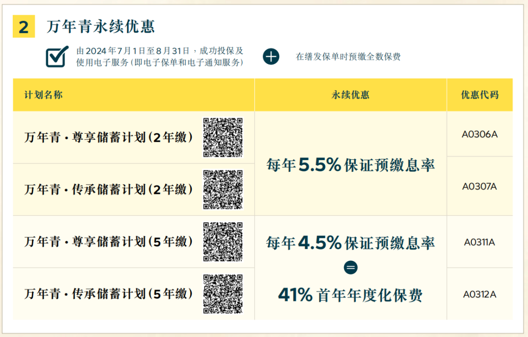 ②永续优惠:5年缴,预缴保证利息4.5%;2年缴,预缴保证利息5.5%;