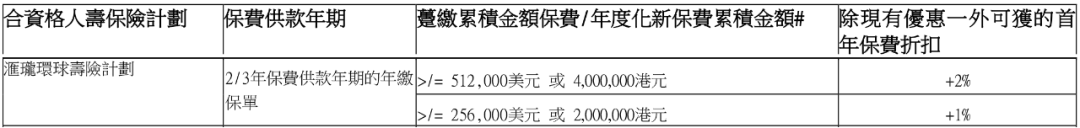 以下合资格客户投保「汇珑环球寿险计划」,额外享0.1%(趸缴)或1%(期缴)保费折扣优惠。