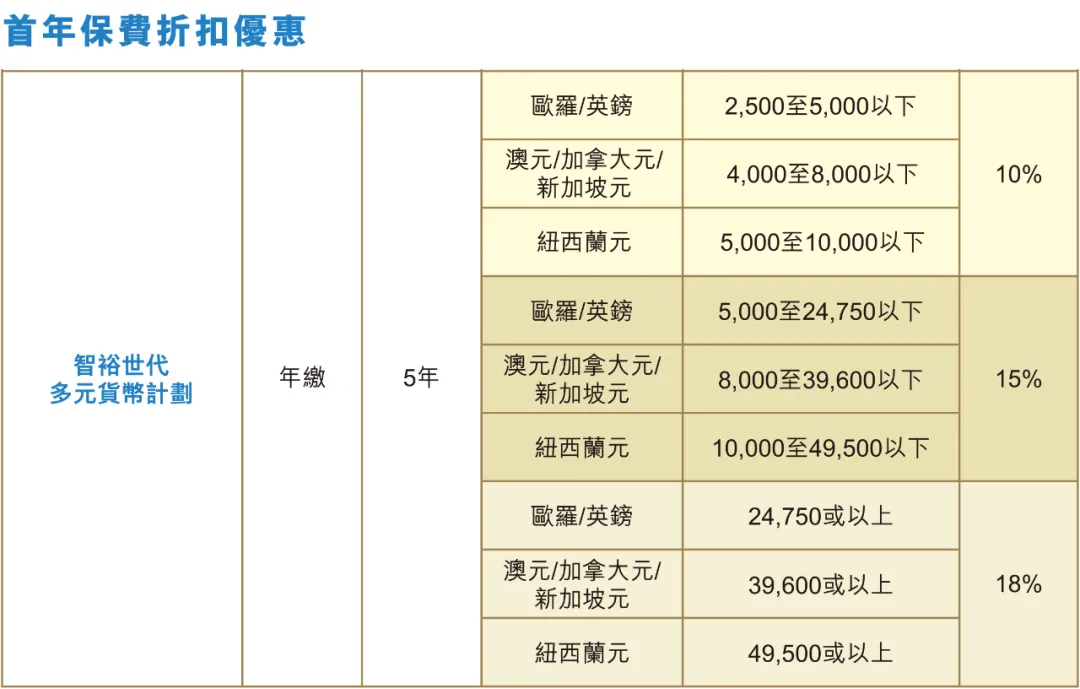 ②. 首年年交保费≥2,500美元,享首年15%保费折扣。