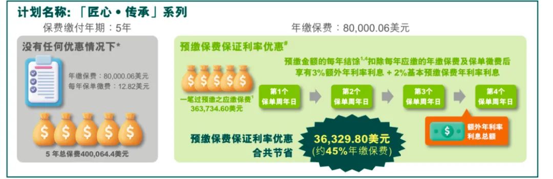 优惠二:预缴2年美元保单保费,保证利率高达4.5%;预缴保费折扣8%