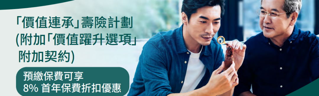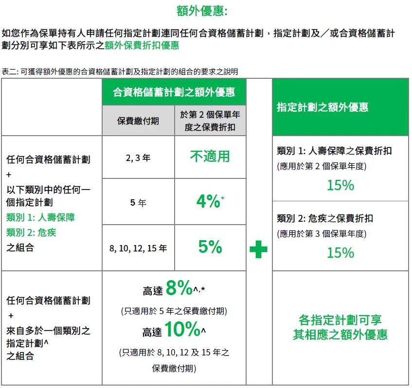 ①. 基本组合优惠:申请任何指定及合资格组合计划,于第2或第3个保单年度分别享高达30%/15%额外保费折扣