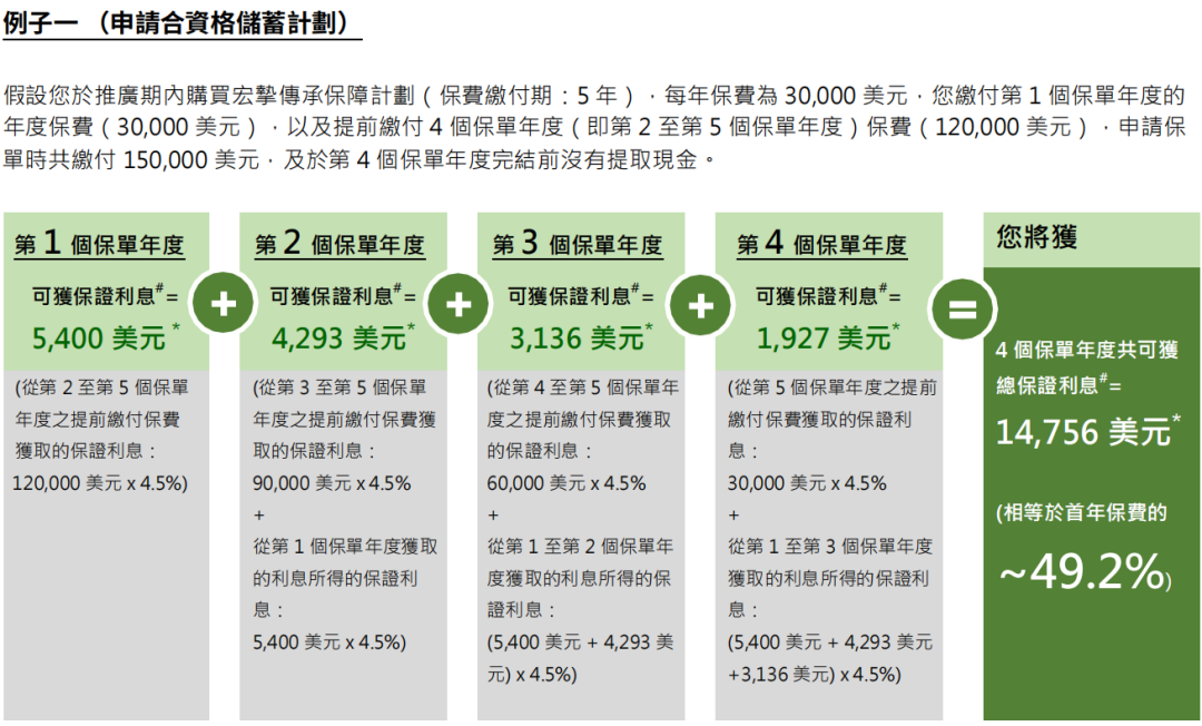 提前缴付合资格储蓄计划并申请指定计划,就提前缴付保费可享每年保证利息高达5.3%(适用于5年缴美元保单)