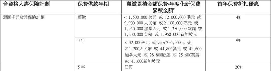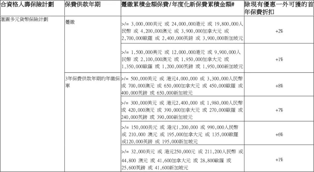 如果投保金额超过一定金额(3年缴,每年保费≥32,000美元;趸缴,保费≥150万美元),额外享1%-8%首年保费折扣。