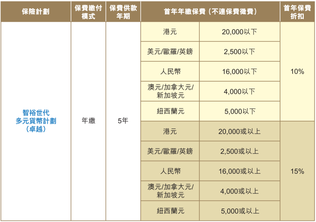 于推广期内成功投保智裕世代多元货币计划(卓越),可享首年保费折扣高达 15%!