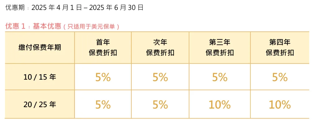 保费≥256,000美元(2/3年缴),额外享1%-2%首年保费折扣。