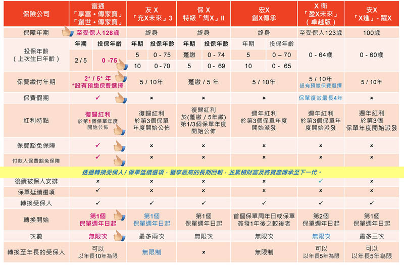 市场独有双传承:生前传承,死后亦可传承!保单可以无限次转换受保人直到新受保人128岁!完美做到了保单传承的无限期。