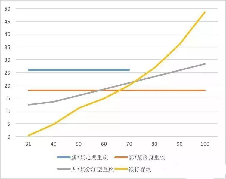 如果买内地的保险,保额增长幅度非常小,如果跟年化3%的银行存款相比,差不多到70岁后就赶不上了,一直到100岁保额都还没增长到30万。