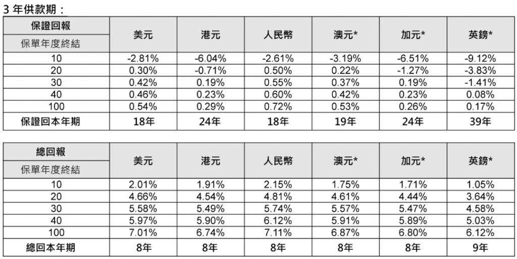「隽富」有2种缴付期,分别是3年缴和5年缴,各种货币回报如下: