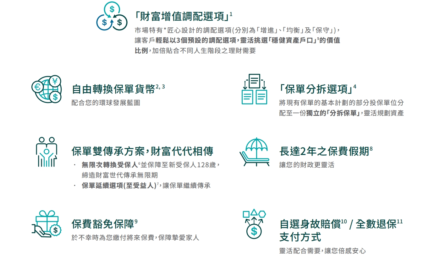 「匠心传承」设有「货币转换选项」「保单分拆选项」及「保单双传承」等优势,由财富增值以至资产配置,让客户能运筹帷幄。还设有2年及5年保费缴付年期,配合多项灵活多变特点,回报周期更短、现金流更优、三档投资策略任选、帮助客户掌握理财自主性,开拓更多可能!
