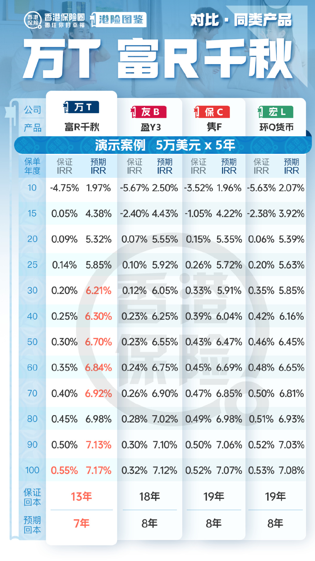 比起「富饶传承3」,「富饶千秋」预期回报IRR提升,2年缴预期回报达7.21%,5年缴预期回报达7.18%,长线增值潜力更高。
