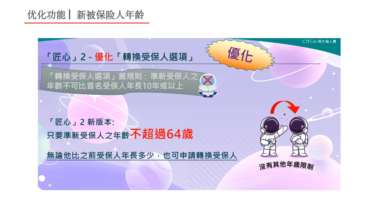 「匠心传承2」在提领方案上进行了全面优化,不仅保留了原有的5、6、7年提领选择,还新增了更多灵活的选择,以满足不同客户的需求。这一升级,无疑让「匠心传承2」在市场竞争中更具优势,也为客户提供了更多的选择和便利。