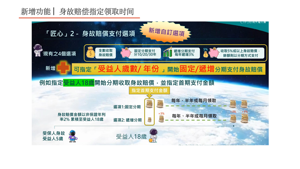 新增功能「匠心 2」周全保单传承方案允许保单持有人为每位受益人度身订造受益方案,让受益人在受保人身故时以最合适的安排收取身故赔偿。例如,女儿可以选择行使保单延续选项,太太可以选择定期收取赔偿,指定仔女可以在18岁开始分期支付,母亲则可以选择一次性收取赔偿。