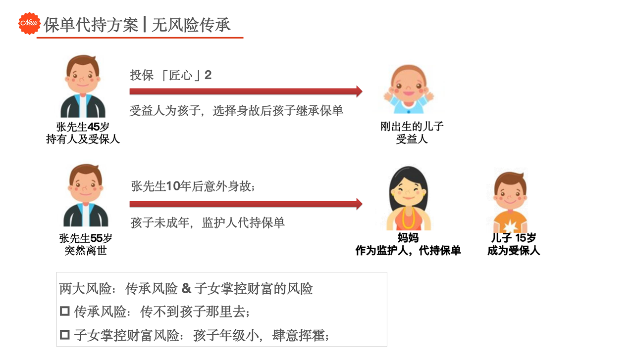 保单代持方案可以帮助客户解决两大风险——传承风险和子女掌控财富风险。通过指定孩子继承时间点,待孩子成年后再进行传承,防止孩子肆意挥霍;同时约束监护人的行为,防止他们擅自退保或提取超过一定比例的现金价值。