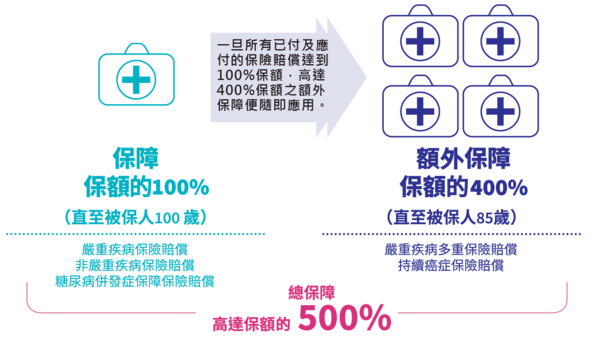 当所有已付及应付的保险赔偿达到保额的100%,「爱护同行」仍会就癌症、心脏病发作及中风提供多达4次赔偿。保障直至被保人85岁。连同持续癌症保险赔偿,「爱护同行」可就癌症、心脏病发作及中风提供高达保额的400%之赔偿。「爱护同行」的总保障最高可达保额的500%。即使危疾再臨,您也可得到充分保障!