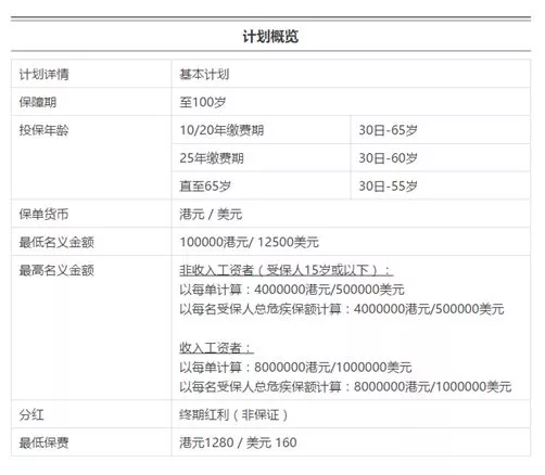 该计划有四个保费缴付期可以选择:10年、20年、25年或供款至受保人65岁。保费于选择的保费缴付期内不会增加及保证不变。